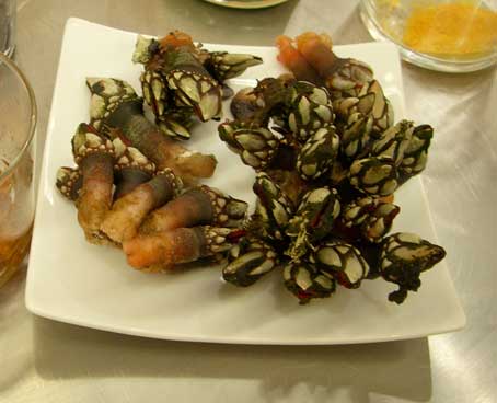 Percebes, oftewel – volgens mij merkwaardig vertaald – de eendenmossel, is een curieuze delicatesse die uitsluitend voorkomt aan de kust van Galicie (Noord Spanje). Het is in tegenstelling tot wat de naam doet verwachten geen mossel maar een ‘kreeftachtige’. In Spanje en Portugal wordt percebes als heerlijk maar ook dure lekkernij beschouwd. Rondom de vangst van percebes hangen stoere verhalen. Zogenaamde stekers dalen daadwerkelijk aan touwen de rotsachtige, steile kust van de Atlantische Oceaan af om daar, midden in de woeste branding, deze kreeftachtige los te hakken of te snijden. Vaak zit er dan ook aan een bos percebes nog daadwerkelijk een stuk steen.