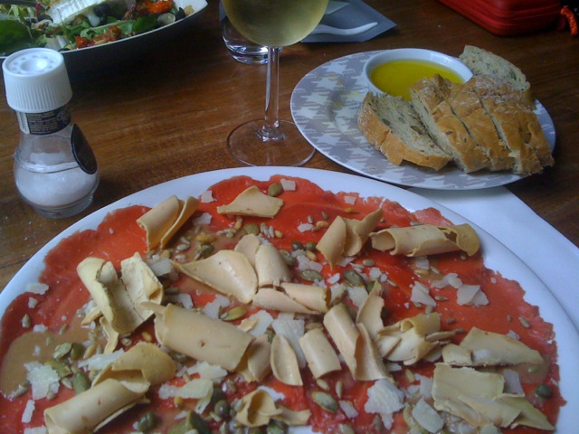 In een eerdere blogpost hebben we over het restaurant “Vuur” geschreven. Geen bijzondere kaart maar wel iets bijzonders, “Het flensje van Vuur”. Voortreffelijk. Al jaren komen wij, met enige regelmaat, in de brasserie “Stijl” in Laren (Brasserie Stijl, Naarderstraat 46, www.brasseriestijl.nl). Prachtige en zeer sfeervolle plek, groot en mooi terras, ruime parkeergelegenheid. Kortom, ideaal, maar de kaart …. die is gewoon, heel gewoon. Met voor mij 1 uitzondering, de carpacio met eendeleverkrullen. Daar rij ik dan toch maar weer voor om.Is hij goed gemaakt? Nou niet echt, want heel veel verkeerd kan je er niet aan doen. Inkoop goed, recept ook goed. Dat wil zeggen, waar ik nu werkelijk de pest aan heb is de terreur van rucola. In beginsel wellicht een prettige sla-soort maar in essentie bitter. En juist die uitgesproken smaak maakt dat het moeilijk combineerbaar blijkt. Des te vreemder is het dat in willekeurig welk restaurant met willekeurige welke gerechten vaak – en ten onrechte – rucola als vanzelfsprekend wordt geacht. Onbegrijpelijk, want die wat ‘harde’, bittere smaak laat zich wel zeker maar niet makkelijk combineren. Dat maakt overigens de “carpacio met eendeleverkrullen” in Stijl niet minder de moeite waard. Maar wanneer ik deze voortreffelijke carpacio bestel gaat het steevast gepaard met het verzoek om de rucola achterwege te laten.