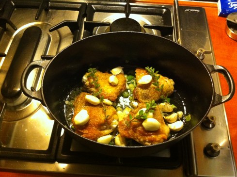 We hebben nog een recept van Nigelle Lawson gemaakt, al was het alleen al om de titel van het recept “Kip met 40 tenen knoflook”. Weinig Nederlanders zullen zich met enthousiasme aan dit recept overgeven want nog steeds wantrouwen volksstammen dit mediterrane bolgewas. Voor menig kok is knoflook randvoorwaardelijk in de keuken en dat geldt zeker ook voor ons. We hebben het recept uitgeprobeerd en eerlijk gezegd … het is erg lekker en ook bijzonder
