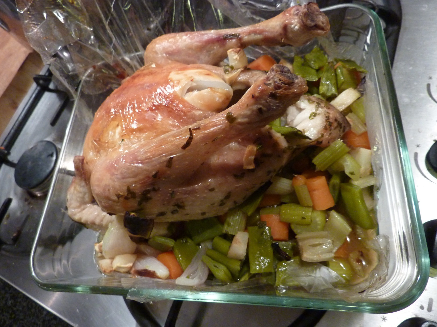 Verwarm de over voor op 180 graden. Vul voor 4 personen een zak met een biologische kip en doe alle ingrediënten er bij wat je lekker vindt. Zak sluiten met binder en een mini hoekje eraf knippen als ventiel. In de oven op 180 C en na 60 minuten is het klaar! Wat salade erbij en Turks brood om in het heerlijke braadvocht te dopen.