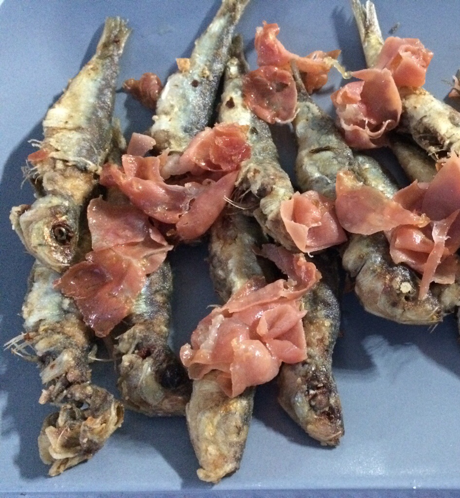Kleine gefrituurde ansjovisjes. Niet zo zout als de in olie en zout ingelegde filetjes uit blik. Ze smaken meer naar kleine sardientjes. Je kunt ze met huid en haar eten. Maar het graatje eruit en de kop eraf gaat ook goed. Heerlijke smaak, zeker met de stukjes gebakken Seranoham. Kunnen we elke dag wel eten. Gespot bij La Fuente in Andrin. Het restaurant van onze oude vriend Pepe.