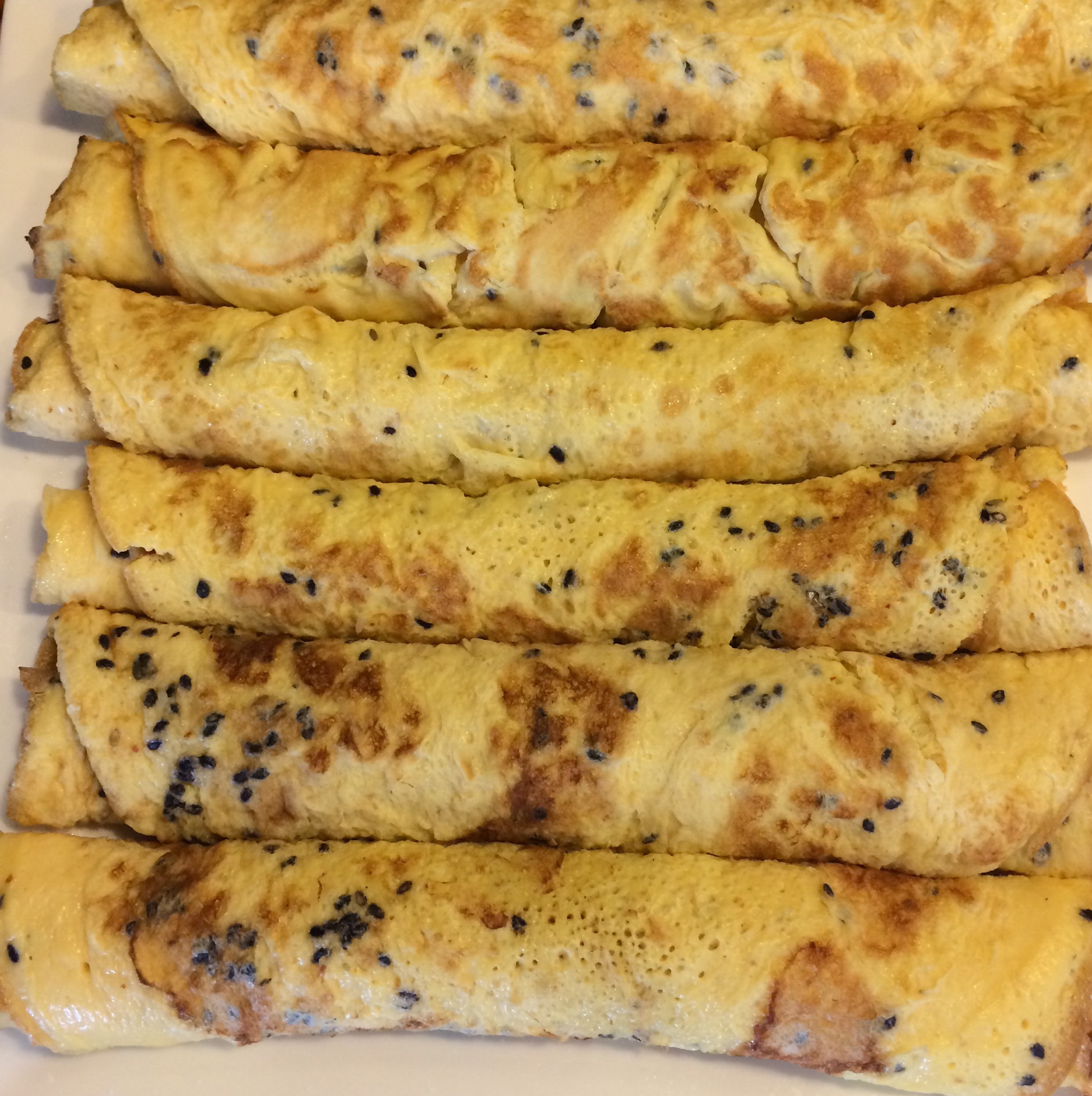 Makkelijk en lekker hapje of bijgerecht. Voor 6 rollen kluts je 8 eieren met 75 ml sojaroom, 2 eetlepels sesamolie en wat zout door elkaar. Rooster 4 eetlepels sesamzaadjes en roer dit door het mengsel. Bak 6 dunne flensjes in een koekenpan met anti-aanbaklaag en een klein beetje olie. Rol ze op. Voor hapjes snijd je ze in stukjes. Lekker met wat chilisaus. Als bijgerecht kun je een hele rol serveren, bijvoorbeeld bij nasi of gado gado. Kan warm of koud geserveerd worden. Eet smakelijk.