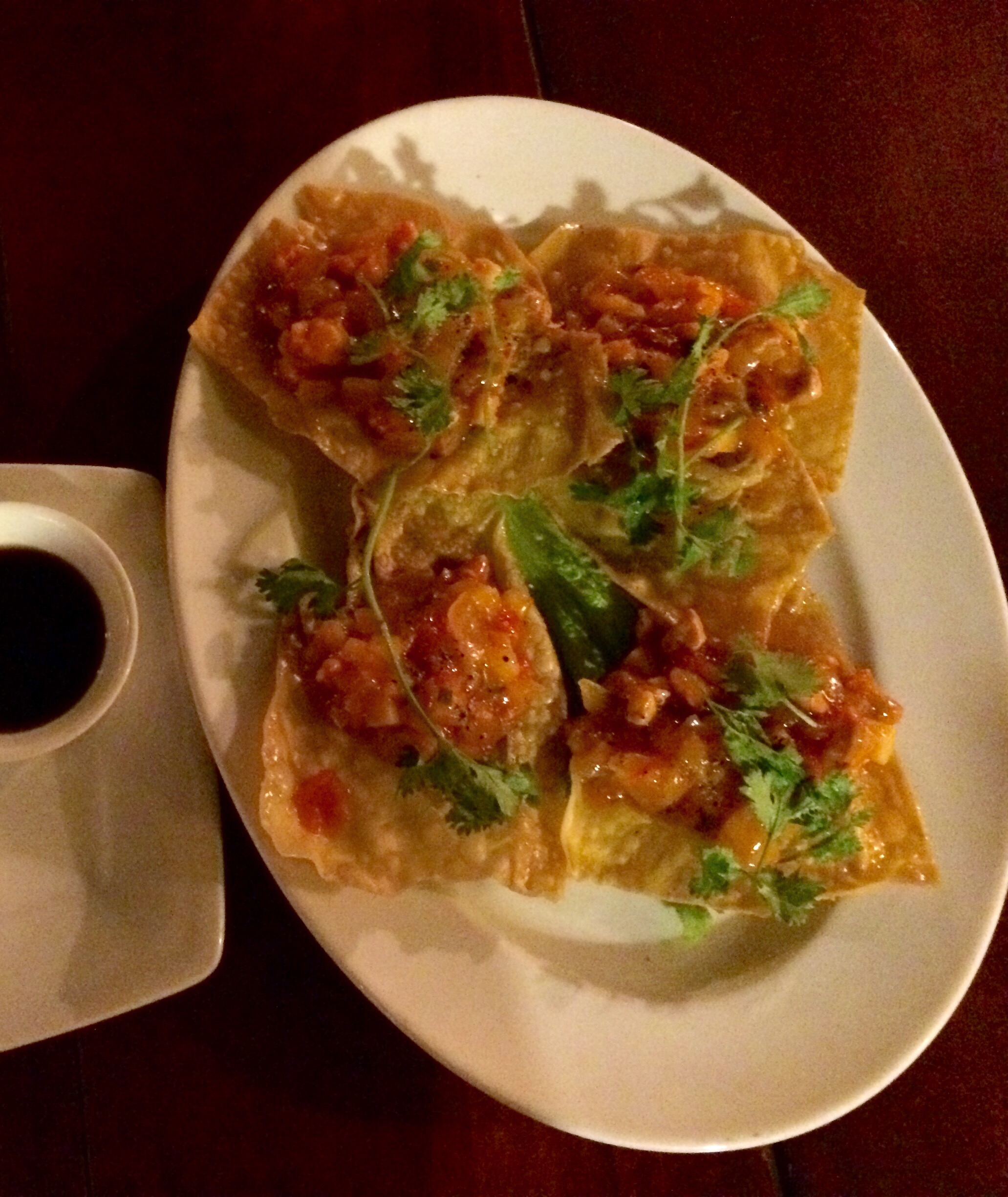 Met een paar voorafjes erbij is het helemaal goed. Hieronder op de foto de wontons. Knapperige bodem met daarop verse garnalen met chutney. Aanrader.