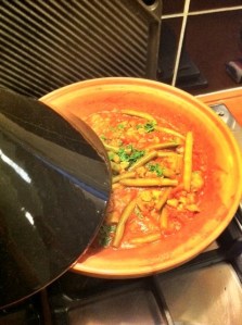 Hele moderne keukenspullen zijn natuurlijk altijd fijn. Maar soms is het ook erg leuk om eens met ouderwetse of traditionele spullen te werken. Dus konden we niet om de Tajine heen. Ik kreeg er een voor mijn verjaardag. Je spreekt het overigens uit als Tasjien. Bijzonder is dat hij gewoon op het vuur kan worden gebruikt. Het is dan wel aan te raden een vlamverdeler te gebruiken. Anders op de grootste pit en het vuur niet te hoog.