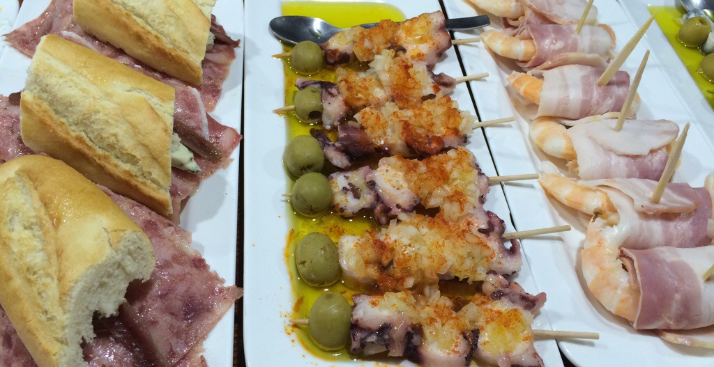 In Nederland wordt niet veel inktvis gegeten. Wordt ook nauwelijks gevangen. In Spanje zie je het volop. En dan niet alleen de gefrituurde ringetjes, maar gewoon vers bereid. Op de foto een tapa met inktvis, gesnipperd uitje en pimenton. Pimenton is paprikapoeder van gerookte paprika. En dat proef je goed; een diepe rooksmaak. Goede olie erover. Echt lekker. Gespot in bar Otamendi in Zarautz. Ook lekkere Rioja daar, voor weinig. Op de foto overigens links een tapa met zure zult en blauwe kaas en rechts een gamba met gekookt spek.