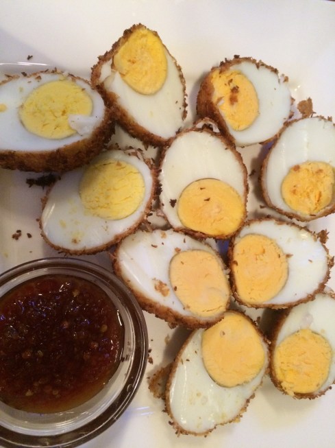 Pel de hardgekookte eieren. Haal ze door de bloem, dan door het losgekopte ei en daarna door de geraspte kokos met 5-kruidenpoeder. Frituur ze vervolgens ongeveer 3 minuten tot de korst goudbruin is. Laat uitlekken op keukenpapier. Warm of koud serveren met de chili jam.