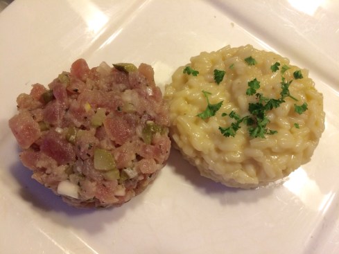 Dit is een prettige combinatie. Zou je misschien niet direct verwachten: koud en warm, romig en zuur. En met name het scheutje kikkoman soja door de tonijn lijkt misschien vreemd. Maar dat werkt prima als smaakversterker en als tegenhanger voor het citroensap. De rasp van de citroen zit door de risotto. Daar zit de verbinding van de twee gerechten. De risotto is extra smeuïg gemaakt met een beetje ghee, een eidooier en wat geraspte Peccorino.
