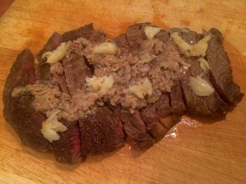 Weer een heerlijk recept uit Vis uit blik. Met een blikje ansjovis maak je zo’n sappig stuk ribeye heel bijzonder. En ja, met de gepofte knoflooktenen erbij is het helemaal af. Heel makkelijk en gegarandeerd succes. We hebben een paar kleine aanpassingen gedaan omdat we plantaardige margarine hebben gebruikt in plaats van roomboter.