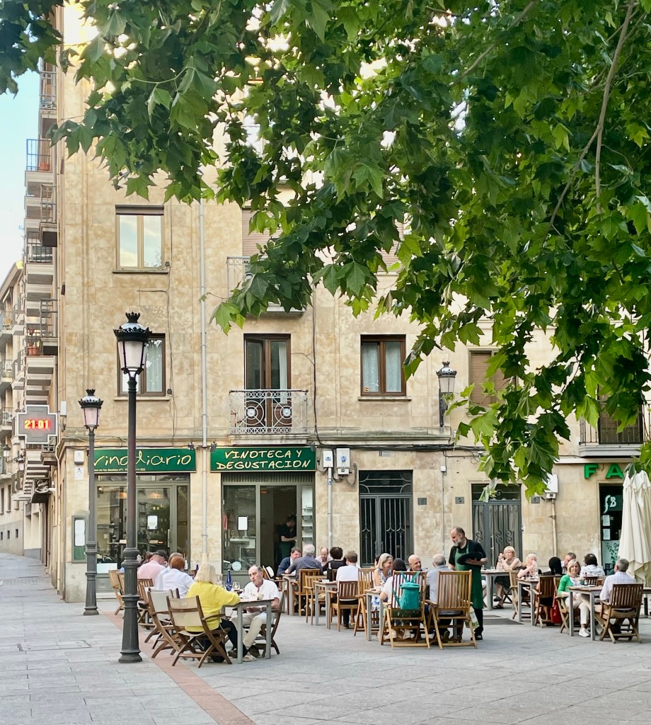 Salamanca is een heerlijke stad om in rond te slenteren. Met de meer dan 800 jaar oude universiteit en de enorme kathedraal is het echt de moeite waard. Bij die bezienswaardigheden zitten vaak niet de beste restaurants maar de tourist-traps zoals wij dat noemen. Voor echt lekker eten moet je wijken in. Zoals ook bij Vinodiario Puur eten, mooie wijnen. En heel betaalbaar. Flesje rosé voor €12,50.