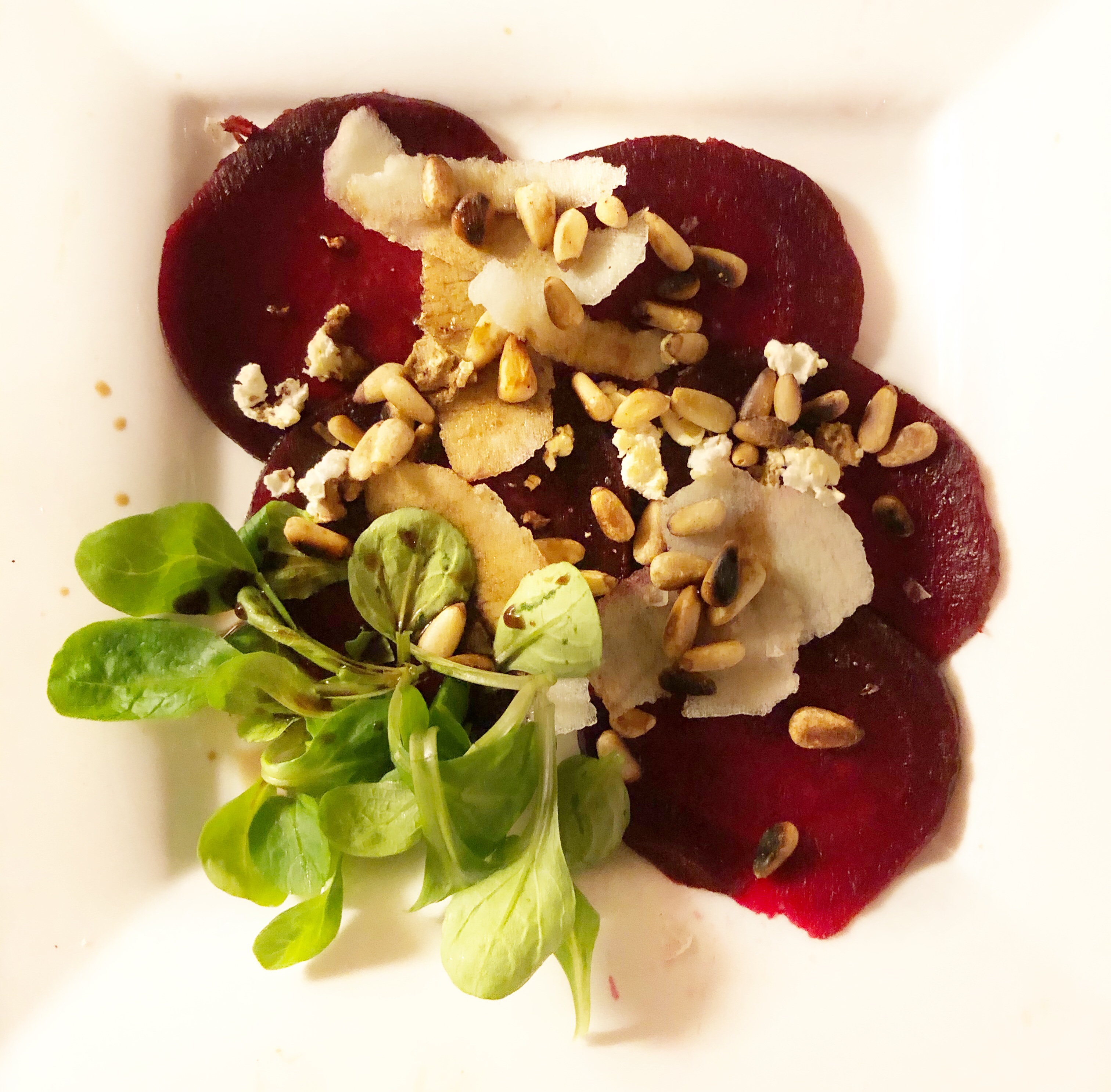 Snijd de bieten in flinterdunne plakken en leg ze op de borden samen met een plukje sla. Verkruimel de geitenkaas erover. Schil en schaaf de appel met een dunschiller. Verdeel dit samen met de pijnboompitjes over de bieten en besprenkel alles met de Balsamicoazijn. Eet smakelijk!
