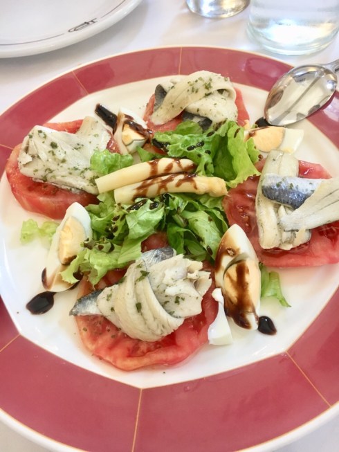 Dit bedoelen we nu met de eenvoud van de Noord-Spaanse keuken. De combinatie van de mooiste ingrediënten die samen een smaakexplosie geven. Deze salade aten we in Llanes, in de provincie Asturias bij Restaurant El Convente, inderdaad in een voormalige kapel. De sardientjes zijn gegaard in appelazijn. De tomaten zijn groot en zoet. De asperges zijn een beetje ziltig. De balsamicocrème past er erg goed bij. Deze gaan we thuis zeker vaak maken.