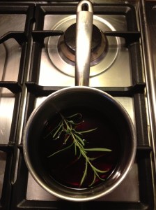 Haal de konijnenpoten en de takjes rozemarijn en thijm uit de pan en bind de saus met wat allesbinder of maizena. Leg de poten terug en warm goed door.