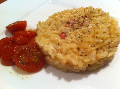 Je hebt een heerlijk stuk vlees op het menu staan, maar je wilt er eigenlijk niet de traditionele aardappelkroketjes of aardappelpuree bij serveren? Maak er dan deze risotto bij. Lijkt misschien wat zwaar, maar als je de porties klein houdt kan het best. Lekker fris met de geroosterde tomaatjes. Let op, bij risotto komt het echt op timing aan, je kunt het niet van tevoren maken en dan opwarmen. Bereiden kost je ongeveer 20 minuten, dan direct serveren.In geval van nood, kun je het nog maximaal 10 minuten onder een theedoek laten wachten.