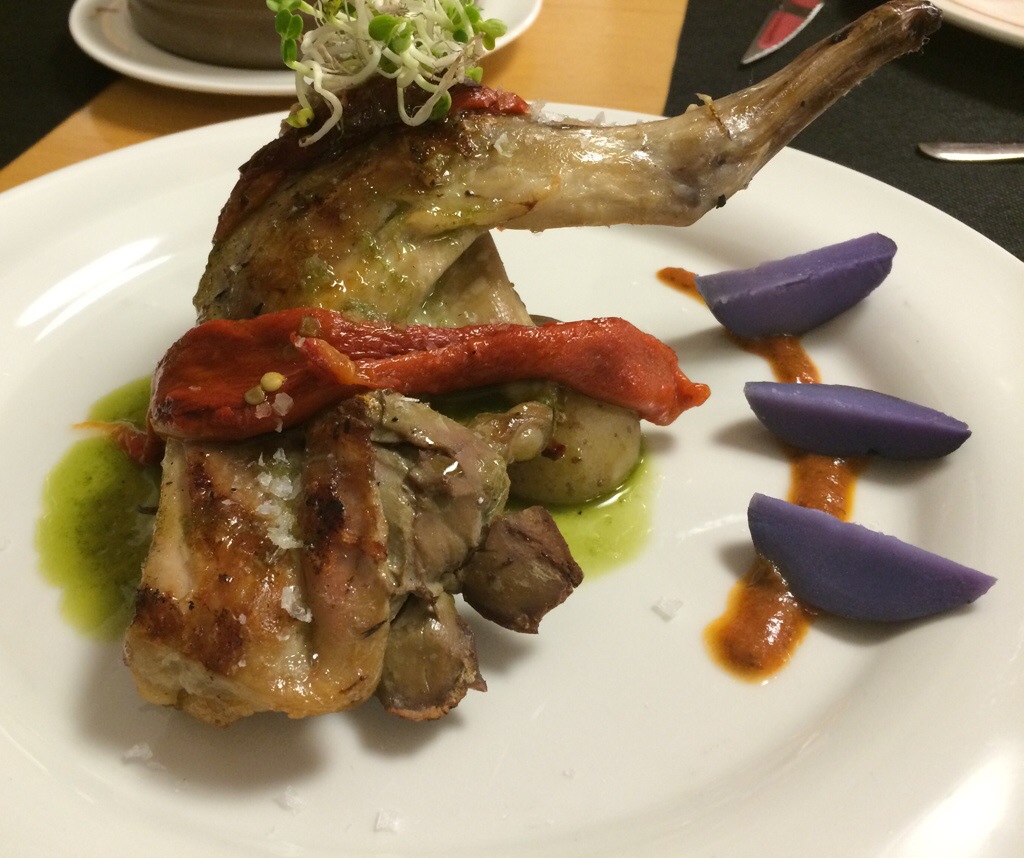 Konijn met knoflook. Dat moet wel goed zijn. Maar dit plaatje hadden we niet verwacht. Ziet er toch culi uit? Niet met de witte alioli met mayonaise, maar met een kruidenolie met veel knoflook en peterselie. Geserveerd met paarse aardappelen en een mousse van paprika. Gegeten bij Tierra de Biescas in de Pyreneen.