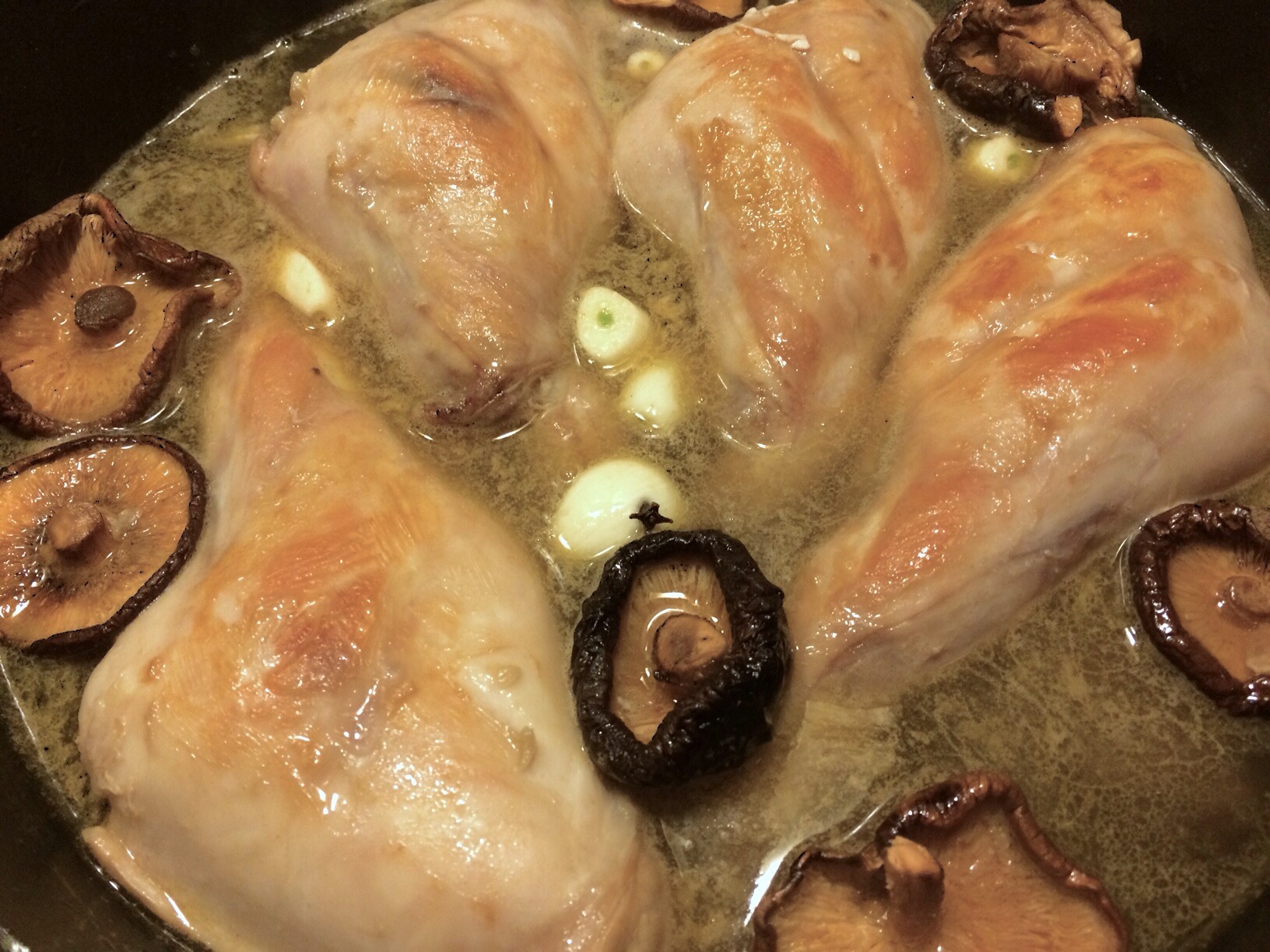 Konijn stoven in sherry met shii-takes, knoflook en kruidnagel