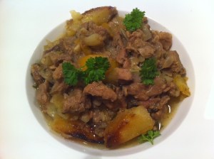 Als de lamstajine na 1 uur klaar is voeg je de aardappelpartjes erbij en laat je ze nog even goed meewarmen. Breng het gerecht eventueel op smaak met zout en garneer met wat verse peterselie. Daarna direct serveren. Lekker met knapperig waldkornbrood of Turks brood.