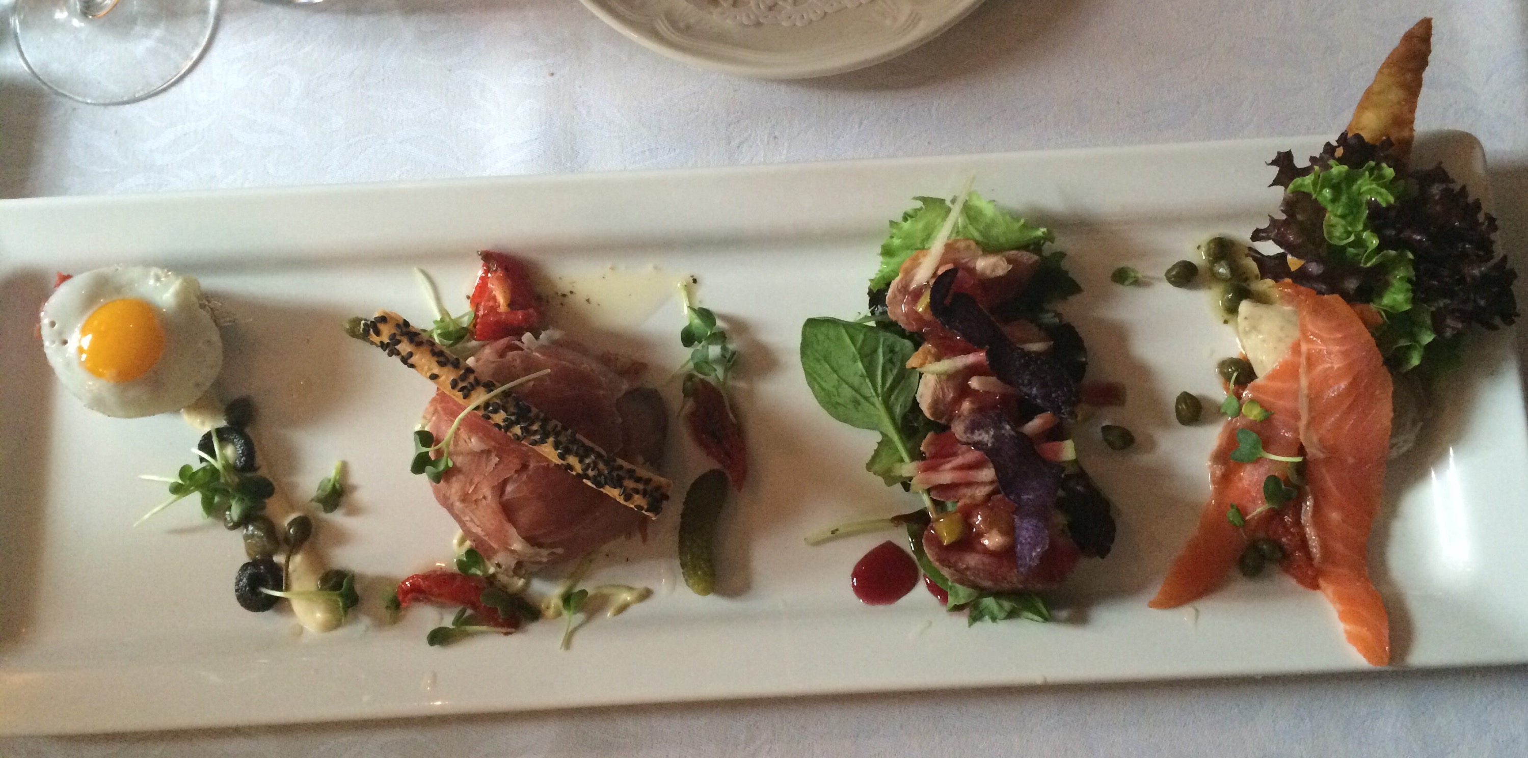 Soms ontdek je van die adresjes waar je vast nog een keer terug komt. Dit is er zo een: Kasteel Essenburgh in Hierden, vlakbij Harderwijk. We waren er op zondag voor de lunch. Er is een eenvoudige lunchkaart met broodjes en salades, maar gelukkig mochten we – na overleg met de keuken – ook van de dinerkaart kiezen. Dat was een feestje. Op de foto zie je de proeverij van voorgerechten: steak tartare, serranoham, eendeborst en zalm met makreelmousse. Het restaurant zit in de kelder met mooie gewelven. Prettige sfeer, goede bediening. Ja, we komen zeker terug.