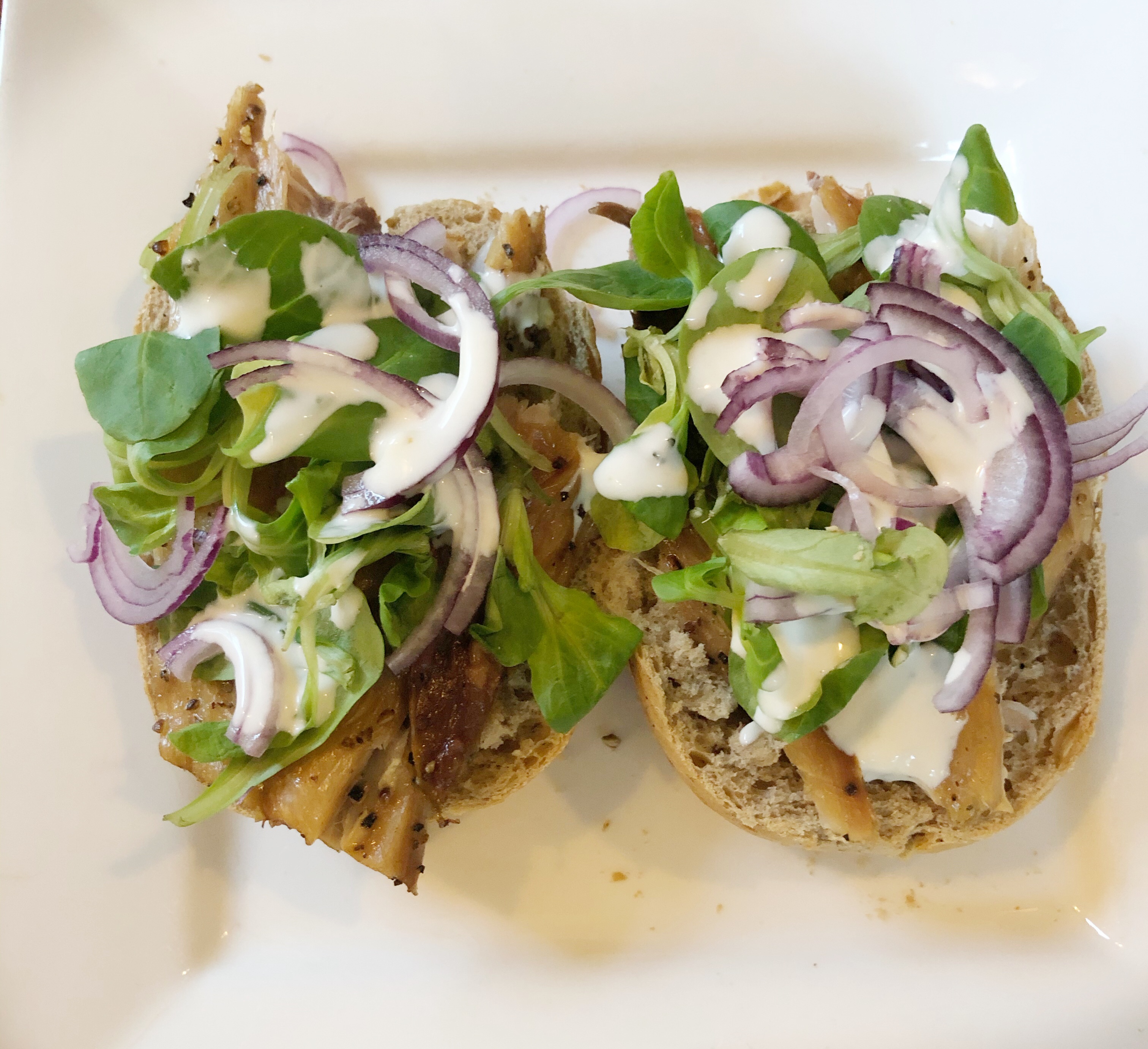 Dit is wel een beetje een guilty pleasure. Maar stel je voor: smeuïge gerookte makreel, knapperig rood uitje, frisse veldsla en pittige wasabimayonaise op een knapperig versgebakken broodje. Te lekker.