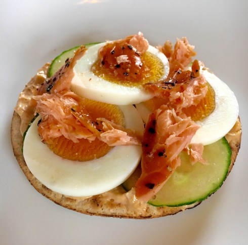 Het schijnt dat 1,5 miljoen gezinnen met Pasen Matzes eten. Een heuse traditie dus. Met roomboter en bruine suiker. Of met kaas. Beetje saai vinden wij. Dus de matze houden we erin, maar hij wordt rijkelijk belegd. Deze is met humus, komkommer, gekookt ei en warmgerookte zalm. Beetje zeezout erover, heerlijk.