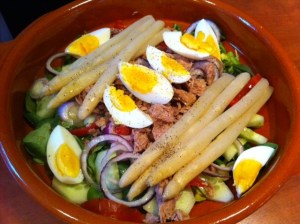 Ik heb vele goede herinneringen aan de ensalada mixta. Tijdens de vele reizen door het favoriete Noord Spanje (Baskenland, Cantabria en Asturias) bestel ik het eigenlijk dagelijks. In de standaard Spaanse restaurants heb je ook weinig keus, al maken ze de salade in ieder restaurant weer net even anders. Vaste ingrediënten zijn overigens de tonijn, asperges, ui en ei. Vaak ook nog tomaat en olijven. En soms met geraspte wortel en mais. Deze is eigenlijk heel klassiek, behalve dan de komkommer, dat kennen ze er nauwelijks.