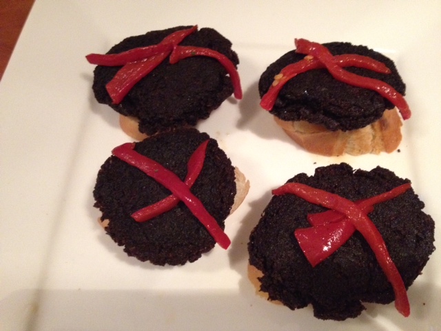 Bloedworst is een mengsel van bloed, reuzel, spek en wordt gebonden met rogge, brood, gerst of havermout. De worst wordt gekruid met een mengsel: peper, kruidnagel, piment, majoraan, laurier en tijm. Soms ook met kaneel. Voor deze Spaanse tapas-variant hebben we nog wat saffraanpoeder en piment toegevoegd. We serveerden het op een stokbroodje met wat geroosterde paprika bij de borrel. Moet je gewoon eens proberen.