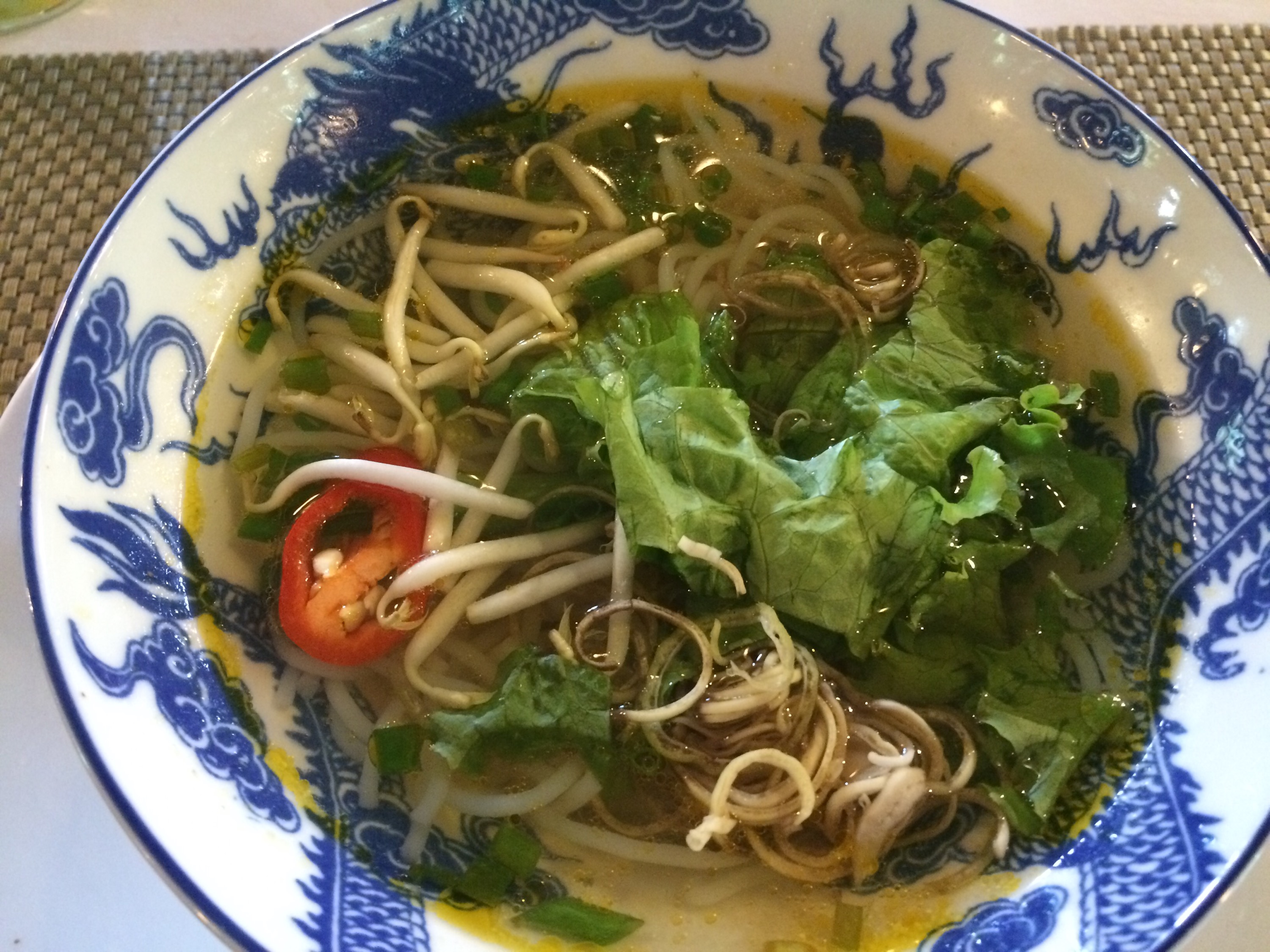 En weer zo’n heerlijk ontbijt in Vietnam. Noedelsoep met rijstnoedels en groente. Daarna nog een gebakken ei en vers fruit. Lekker begin van de dag. Gegeten in Pelgrimage Village in Hue.
