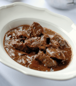 - Doe het vlees terug in de pan en laat twee uur sudderen. Check af en toe het vocht en voeg eventueel wat water toe. Maar zorg dat er aan het eind van de stooftijd bijna geen vocht over is.