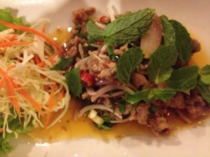 Na een week rondreizen in Thailand hebben we meer dan voldoende geproefd en gefotografeerd om jullie mee te nemen langs een keur aan de heerlijkste gerechten. Hier de Spicy Duck salad. Gehakte eendenborst met pepertjes, munt en limoen. Bijzonder lekker. Gegeten bij Perdnaman in Bophut op Koh Samui.