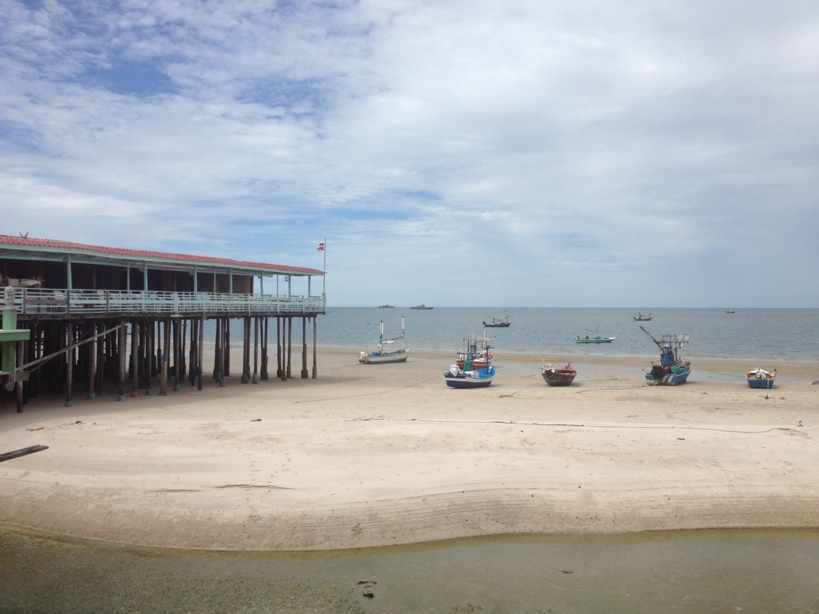 fotoOp reis of niet, bloggen gaat natuurlijk gewoon door. We zijn in Thailand en maken een reis van Bangkok naar Hua Hin, Koh Tao en Koh Samui. Eten in Thailand gaat de hele dag door. Restaurants zijn gemiddeld genomen geopend van 10 uur ’s ochtends tot 10 uur ’s avonds.  Het maakt niet uit wanneer je aanschuift en hoeveel je bestelt; als je trek hebt ga je gewoon ergens iets eten. Geen straf. En zo struinden we een week lang in Hua Hin de hele Naresdamri Road af. Dat is het straatje, parallel aan het strand, dat een keur aan restaurants biedt. Meest Thais, maar ook Frans (Bistro de Paris) en Italiaans (Mama Mia). Wij kiezen natuurlijk het meest voor de Thaise restaurants. Ze zijn gebouwd op palen en hebben een groot terras aan zee.