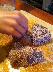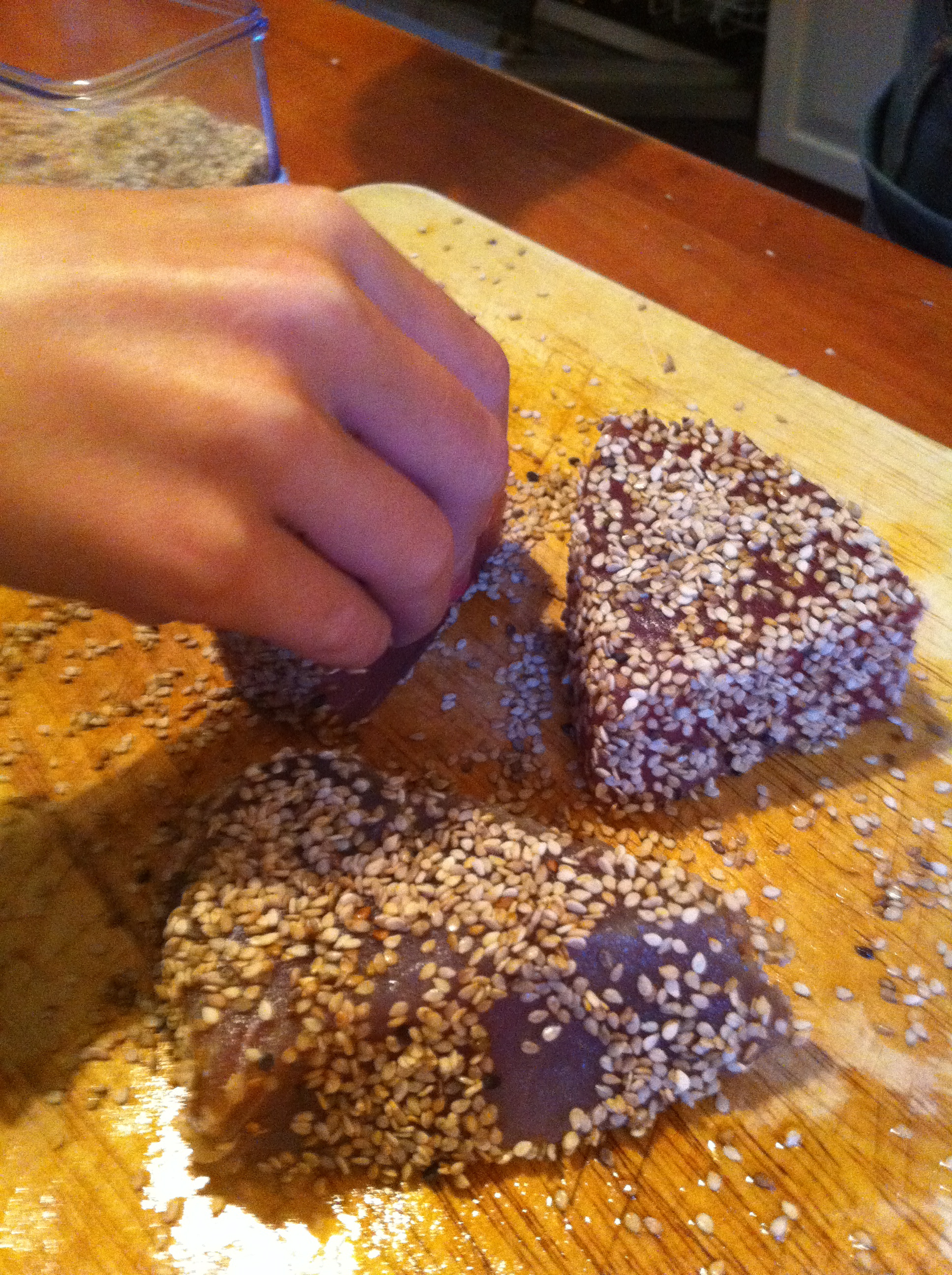 Bak in een droge koekenpan de sesamzaad zachtjes en kort en zorg ervoor dat ze niet aanbranden. Laat ze even afkoelen op een bord. Smeer de stukken tonijn in met een mooie arachide olie. Strooi vervolgens sesamzaad over de tonijn totdat deze rondom goed bedekt is. Bak de tonijn vervolgens 3 minuten aan beide kanten op een middelhoog vuur. Let erop dat het niet te hard gaat maar zorg wel voor voldoende hitte om de buitenkant van een mooie sesamzaadkorst te voorzien en van binnen goed te garen. Korter bakken kan natuurlijk ook en hangt af van je eigen voorkeur voor rauwe of minder rauwe vis. Serveren met schaaltje kikkomansoja.