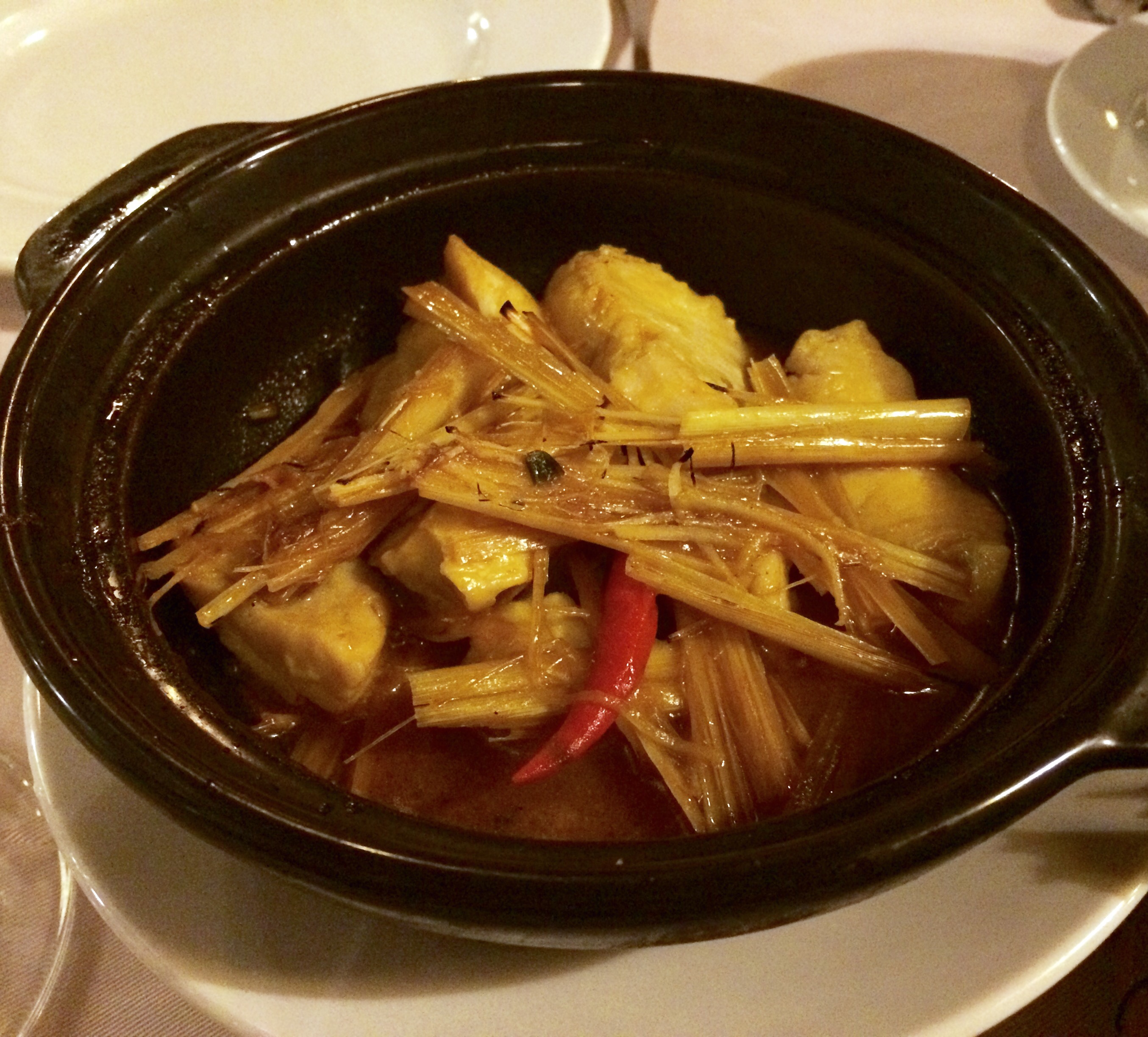 Heerlijk! Vis gestoofd in een pot van klei. Met citroengras, gember en gekarameliseerde vissaus. Geserveerd met gestoomde rijst. Gegeten in Pelgrimage Village, Hue, Vietnam.