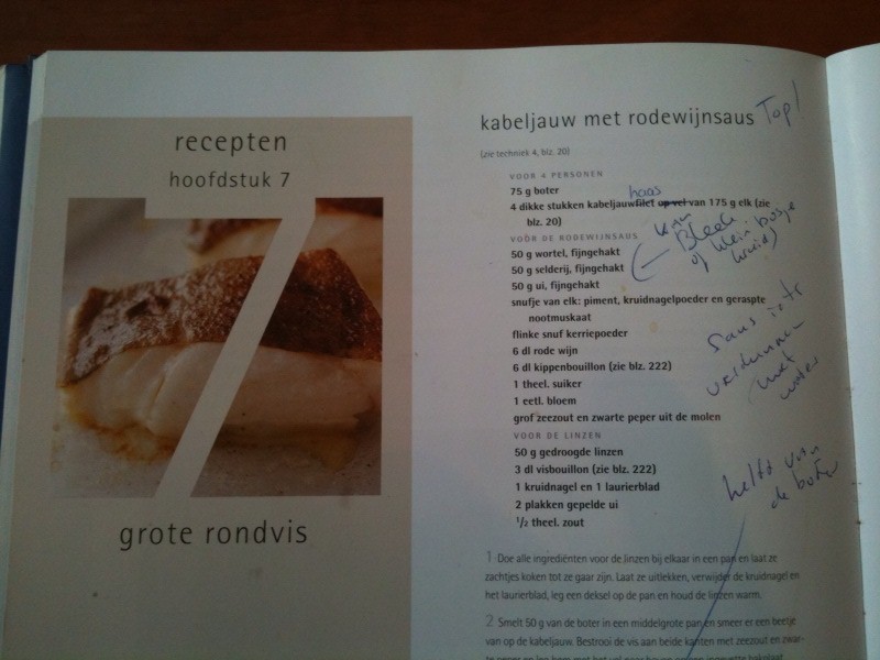 Op de foto staat een recept uit het geweldige kookboek “Verse Vis” van de chef-kok Rick Stein. Het betreft het recept “Kabeljauw met rodewijnsaus”. Mooi en heerlijk gerecht maar daar gaat deze blog niet over. Op die pagina staat van alles bijgeschreven. Kabeljauwfilet wordt kabeljauwhaas (echte lekkerder), de saus moet licht worden aangepast, de hoeveelheid boter in het recept moet worden gehalveerd etc. Inderdaad, wij schrijven vaak in kookboeken. Dat is omdat we het er niet meer eens zijn :-), het niet klopt, we de gerechten niet altijd kunnen krijgen, we geïnspireerd door het recept er toch iets anders van maken etc.