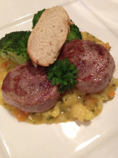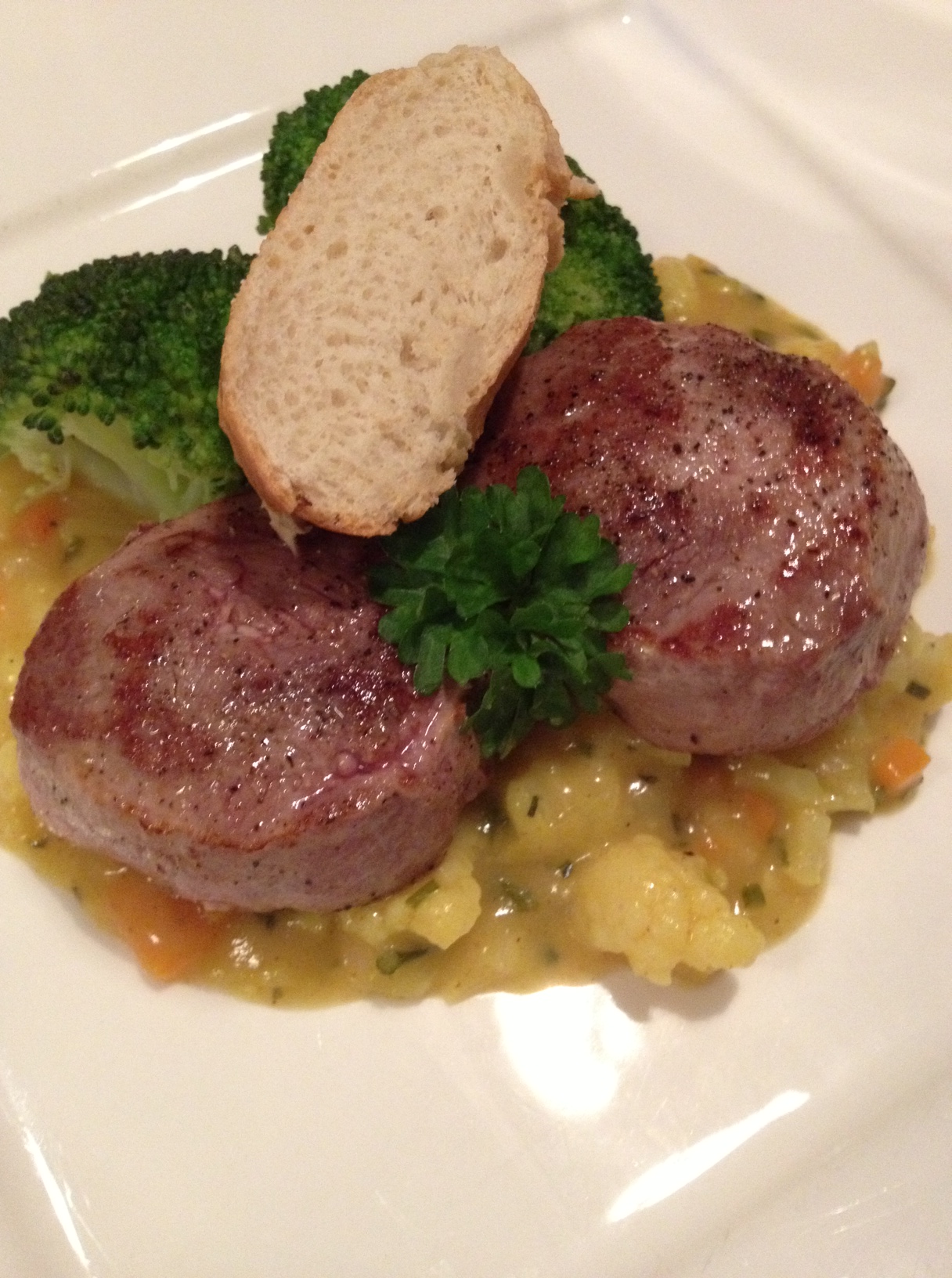 De bediening liep rond in een soort middeleeuwse kleding. Lange bruine rok, wit schort. De menukaart was geheel in sprookjesachtige stijl: een boek. Met een uitgebreide wijnkaart en heerlijke wildgerechten. We aten onder andere kwartelsalade en hertenbiefstuk. Precies goed gemaakt. En samen met de sfeer een echte aanrader.