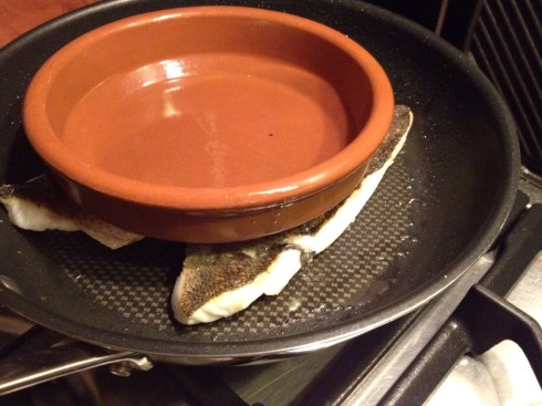 Beetje zout aan beide kanten van de visfilet. 90 seconden op het vel bakken en daarna 60 seconden andere kant. Normaal gesproken zouden we de vis insnijden (huid, niet te diep) om te voorkomen dat de vis gaat krullen maar Blumenthal kwam met een andere tip. Zet er een schaaltje op. Werkt perfect. Vanilleboter erover. Wij aten het met boontjes, zeezout en een fijngehakt rood pepertje.